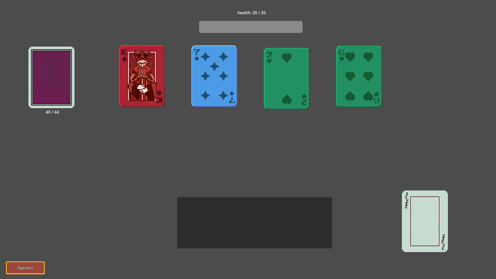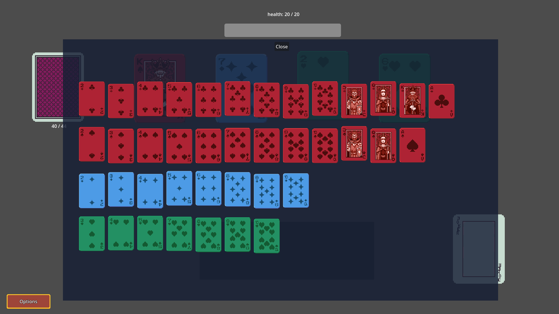 - Diamonds -> Weapons, Hearts -> Healing Potions, Clubs/Spades -> Monsters.